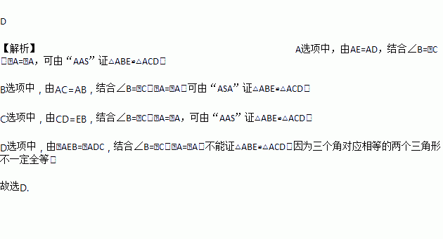 A. AE=AD B. AC=AB C. CD=EB D. ∠AEB=∠ADC