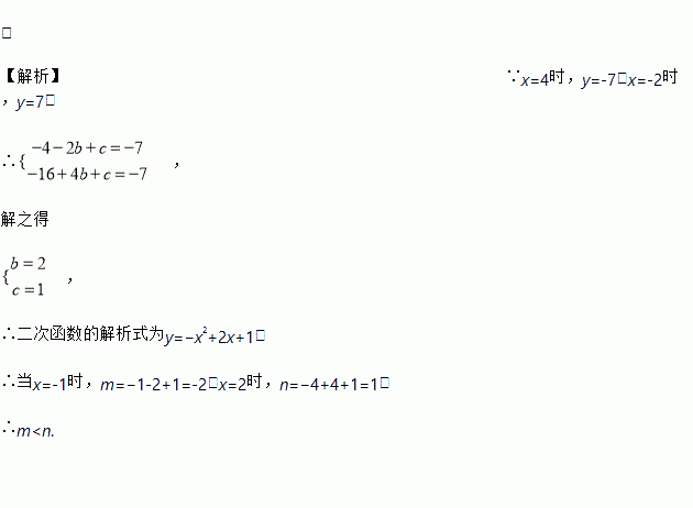 < 【解析】∵x=4时,y=-7;x=-2时,y=7, ∴ , 解之得 , ∴二次函数的解析式为y=?x2+2x+1, ∴当x=-1时,m=?1-2+1=-2;x=2时,n=?4+4+1=1, ∴m