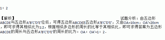 如图,以点O为位似中心,将五边形ABCDE放大后得到五边形A′B′C′D′E′,已知OA=10cm,OA′=20cm,则五边形ABCDE的周长与五边形A′B′C′D′E′的周长的比值是 .