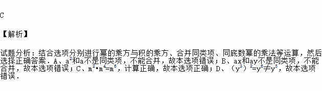C 【解析】 试题分析:结合选项分别进行幂的乘方与积的乘方、合并同类项、同底数幂的乘法等运算,然后选择正确答案.A、a2和a不是同类项,不能合并,故本选项错误;B、ax和ay不是同类项,不能合并,故本选项错误;C、m2•m4=m6,计算正确,故本选项正确;D、(y3)2=y6≠y5,故本选项错误.