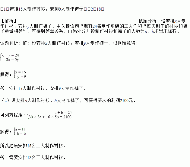 福林制衣厂现有24名制作服装的工人,每天都制作某种品牌的衬衫和裤子,每人每天可制作这种衬衫3件或裤子5条.