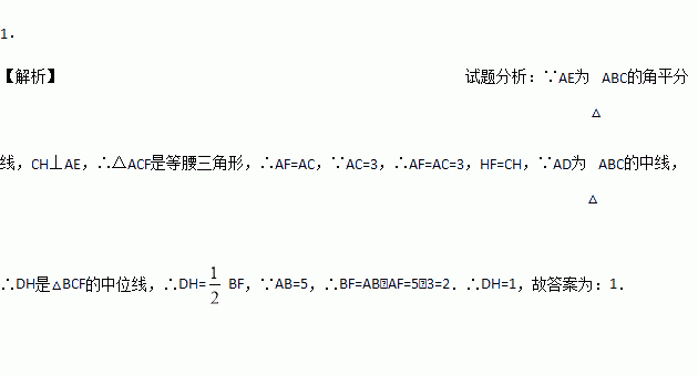 如图,在△ABC中.AB =5,AC=3,AD,AE分别为△ABC的中线和角平分线,过点C作CH⊥AE于点H,并延长交AB于点F.连接DH.则线段DH的长为___________.