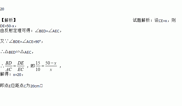 如图,球从点A处射出,经球台边挡板CD反射到点B,已知AC=10 cm,BD=15 cm,CD=50 cm,则点E到点C的距离是____cm.
