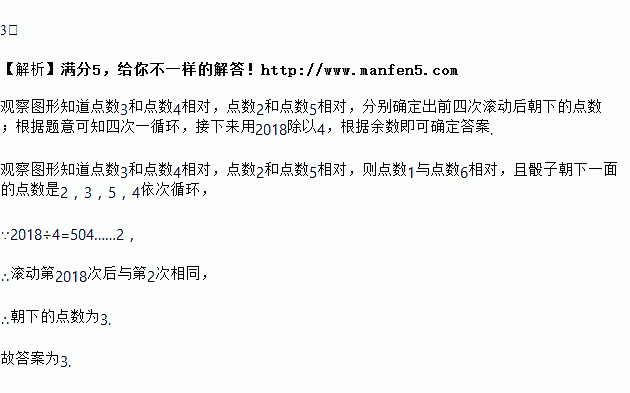 有一个正六面体骰子放在桌面上,将骰子沿如图所示顺时针方向滚动,每滚动90°算一次,则滚动第2018次后,骰子朝下一面的数字是_____.
