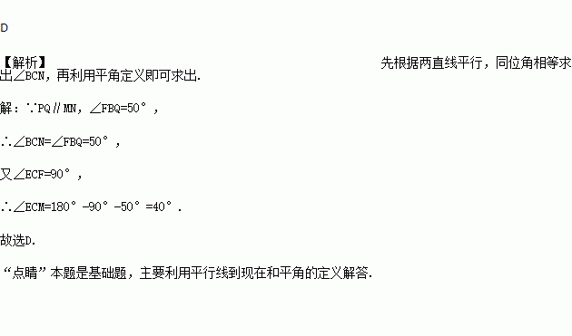 如图,直线,C是MN上一点,CE交PQ于A,CF交PQ于B,且∠ECF=90°,如果∠FBQ=50°,则∠ECM的度数为( )