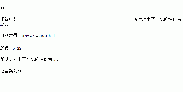 某公司销售一种进价为21元的电子产品,按标价的九折销售,仍可获利20%,则这种电子产品的标价为_________元.