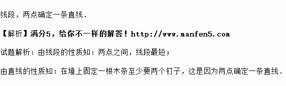 两点之间, 最短;在墙上固定一根木条至少要两个钉子,这是因为 .