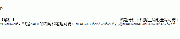 如图,△ABC≌△ADE,AB=AD,AC=AE,∠B=28°,∠E=95°,∠EAB=20°,则∠BAD等于( )