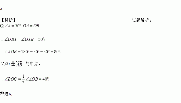 如图,在⊙O中,若点C是 的中点,∠A=50°,则∠BOC=( )