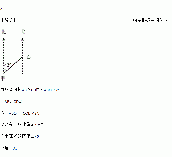 如图,在甲、乙两城市之间要修建一条笔直的城际铁路,从甲地测得公路的走向是北偏东42°,现在甲、乙两城市同时开工,为使若干天后铁路能准确在途中接通,则乙城市所修铁路的走向应是( )