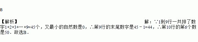 将全体自然数排列成如图所示的三角形数阵,根据排列规律,则数阵中,第10行第6个数是( )