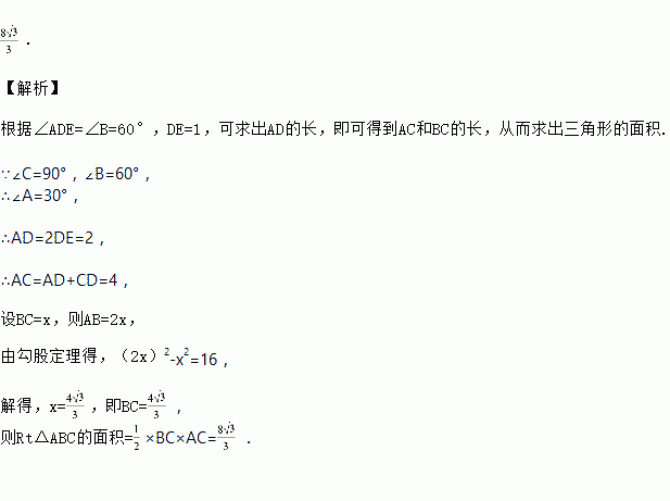 如图,在四边形BCDE中,∠C=∠BED=90°,∠B=60°,延长CD、BE,两线相交于点A,已知CD=2,DE=1,求Rt△ABC的面积.