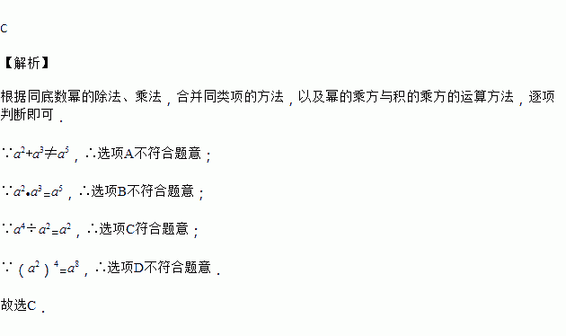 A. a2+a3=a5 B. a2•a3=a6 C. a4÷a2=a2 D. (a2)4=a6