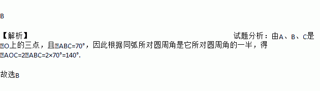 如图,A、B、C是⊙O上的三点,且∠ABC=70°,则∠AOC的度数是( )