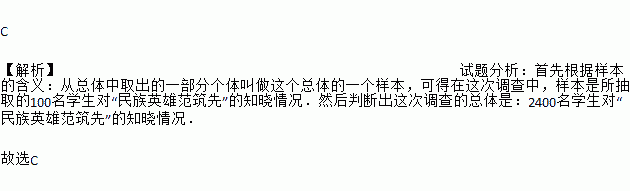 电视剧《铁血将军》在我市拍摄,该剧展示了抗日英雄范筑先的光辉形象.某校为了解学生对“民族英雄范筑先”的知晓情况,从全校2400名学生中随机抽取了100名学生进行调查.在这次调查中,样本是 ( )