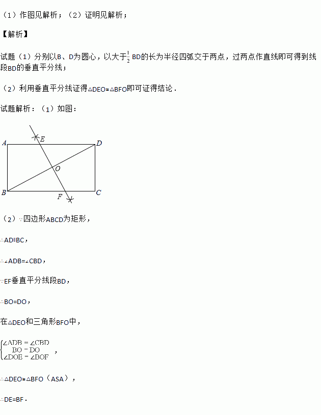 (1)作BD的垂直平分线EF,分别交AD、BC于点E、F,垂足为点O.(要求用尺规作图,保留作图痕迹,不要求写作法);
