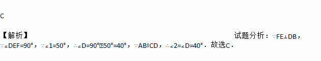 如图,AB∥CD,FE⊥DB,垂足为E,∠1=50°,则∠2的度数是( )