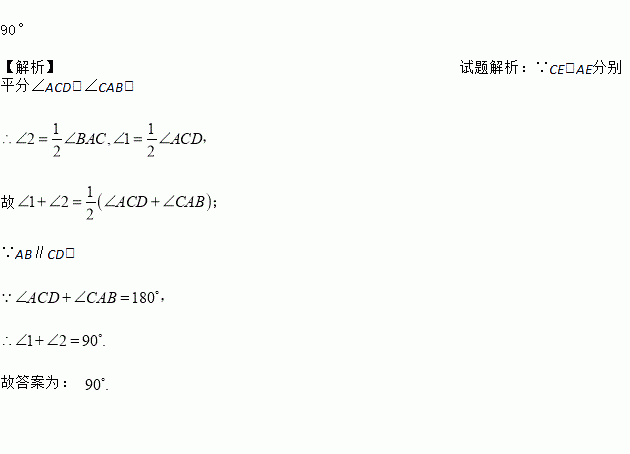 如图,已知AB∥CD,CE,AE分别平分∠ACD,∠CAB,则∠1+∠2=________.