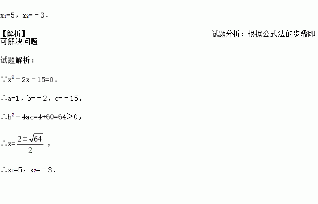 x1=5,x2=﹣3. 【解析】试题分析:根据公式法的步骤即可解决问题 试题解析: ∵x2﹣2x﹣15=0. ∴a=1,b=﹣2,c=﹣15, ∴b2﹣4ac=4+60=64>0, ∴x=, ∴x1=5,x2=﹣3.