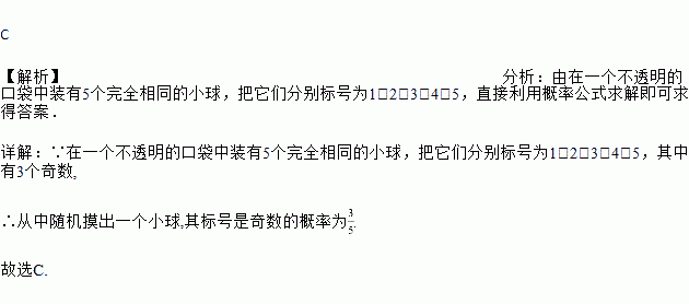 在一个不透明的口袋中装有5个完全相同的小球,把它们分别标号为,从中随机摸出一个小球,其标号是奇数的概率为![]()