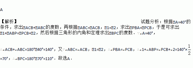 如图在等腰△ABC中,其中AB=AC,∠A=40°,P是△ABC内一点,且∠1=∠2,则∠BPC等于( )