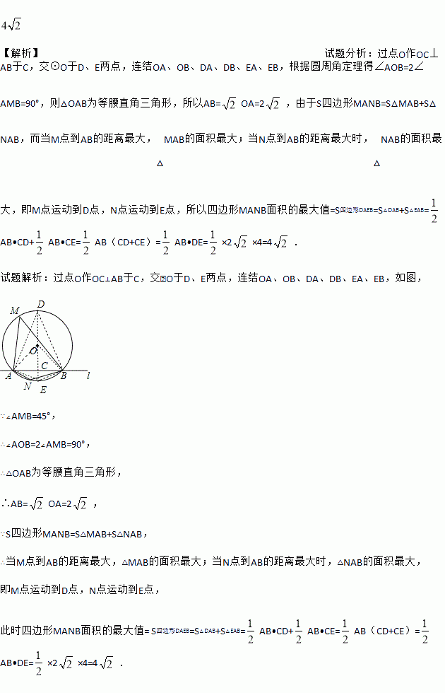 如图,⊙O的半径是2,直线l与⊙O相交于A、B两点,M、N是⊙O上的两个动点,且在直线l的异侧,若∠AMB=45°,则四边形MANB面积的最大值是__.