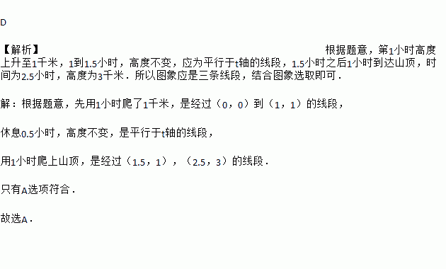 如图,某游客为爬上3千米的山顶看日出,先用1小时爬了2千米,休息0.5小时后,再用1小时爬上山顶,游客爬山所用时间t(小时)与山高h(千米)间的函数关系用图象表示是( )