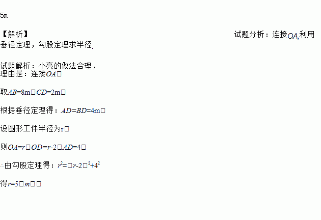 中点到AB的距离CD的长,就能求出这个圆形工件的半径.你认为他的做法合理吗?如不合理,说明理由;如合理,请你给出具体的数值,求出半径。