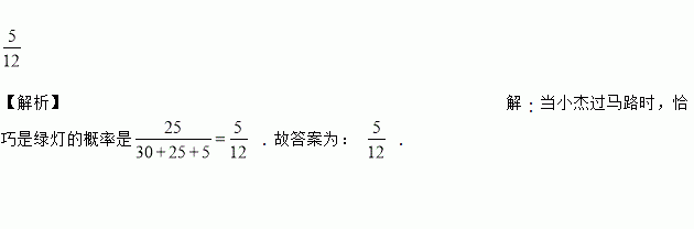 一个十字路口的交通信号灯每分钟红灯亮30秒,绿灯亮25秒,黄灯亮5秒,当小杰过马路时,恰巧是绿灯的概率是_______.