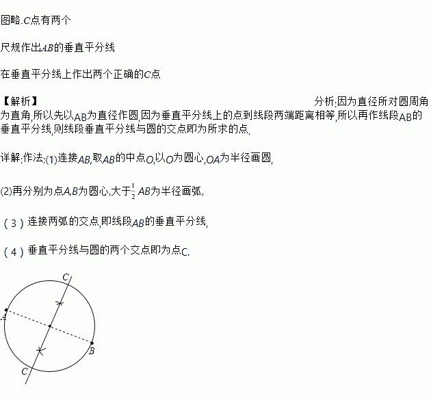 如图,A、B是平面上的两定点,在平面上找一点C,使△ABC为等腰直角三角形,且点C为直角顶点,这样的点C有几个?请用尺规作图确定点C的位置,保留作图迹并说明理由