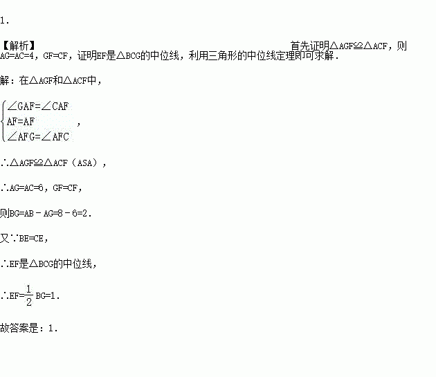 (6分)如图,△ABC中,AB=8,AC=6,AD、AE分别是其角平分线和中线,过点C作CG⊥AD于F,交AB于G,连接EF,求线段EF的长.