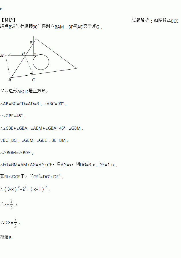 如图,正方形ABCD的边长为3,将等腰直角三角板的45°角的顶点放在点B处,直角顶点F在CD的延长线上,BF与AD交于点G,斜边与CD交于点E