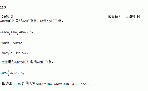 如图,O是矩形ABCD的对角线AC的中点,M是AD的中点若AB=5,AD=12,则四边形ABOM的周长为__________。