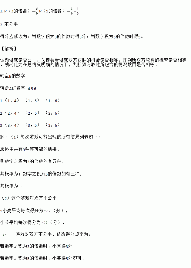 (2)小明和小亮想用这两个转盘做游戏,他们规定:数字之积为3的倍数时,小明得2分;数字之积为5的倍数时,小亮得3分.这个游戏对双方公平吗?若认为公平,请说明理由;若认为不公平,试修改得分规定,使游戏对双方公平.