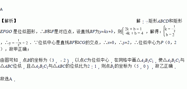 甲:如图①,已知矩形ABCD和矩形EFGO在平面直角坐标系中,点B,F的坐标分别为(﹣4,4),(2,1).若矩形ABCD和矩形EFGO是位似图形,点P(点P在GC上)是位似中心,则点P的坐标为(0,2).
