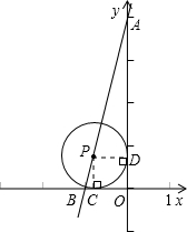 分析:先过P作PD⊥y轴于D,PC⊥x轴于C,设⊙P的半径是x,由于PD⊥y轴,PC⊥x轴,且∠COD=90°,易知四边形PCOD是矩形,而PC=PD,可证四边形PCOD是正方形,而PC∥y轴,利用平行线分线段成比例定理的推论可证△PBC∽△ABO,可得比例线段BC:OB=PC:OA,即(1-x):1=x:4,解可求x,再根据图形可求P点坐标.
