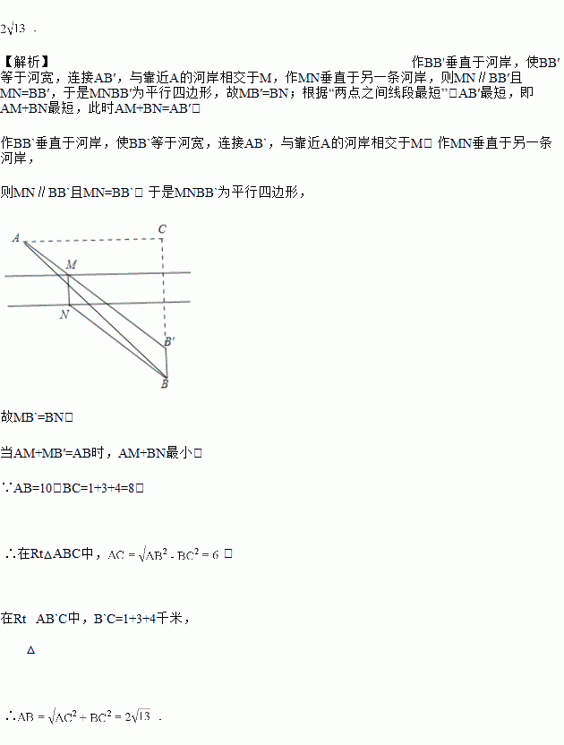 已知,在河的两岸有A,B两个村庄,河宽为4千米,A、B两村庄的直线距离 AB=10千米,A、B两村庄到河岸的距离分别为1千米、3千米,计划在河上修建一座桥MN垂直于两岸,M点为靠近A村庄的河岸上一点,求AM+BN的最小值.