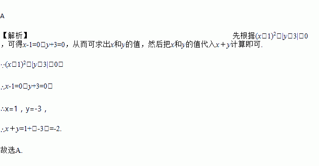 已知有理数x,y满足(x-1)2+|y+3|=0,则 x+y的值为( )