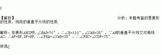 如图,在菱形ABCD中,∠BAD=70°,AB的垂直平分线交对角线AC于点F,垂足为E,连接DF,则∠CDF等于: