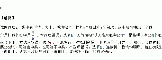 D. 连续掷一枚均匀硬币,若5次都是正面朝上,则第六次仍然可能正面朝上