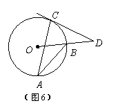 如图6,AB,AC是⊙的两条弦,,经过点C的切线与OB的延长线交于点D,则的度数为_________.