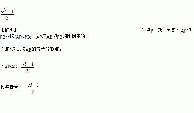 【解析】∵点P把线段分割成AP和PB两段(AP>PB),AP是AB和PB的比例中项, ∴点P是线段AB的黄金分割点, ∴AP:AB=, 故答案为: