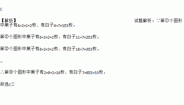 假设有足够多的黑白围棋子,摆成一个“中”字,下列图形中,第①个图形中有4 枚黑子和4枚白子,第②个图形中有6枚黑子和11枚白子,第③个图形中有8枚黑子和18枚白子按此规律排列,则第⑧个图形中黑子和白子的枚数分别为( )