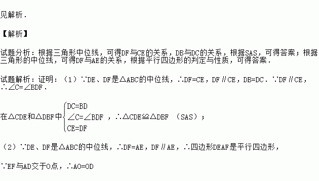 已知:如图,在△ABC中,DE、DF是△ABC的中位线,连接EF、AD,其交点为O.求证: