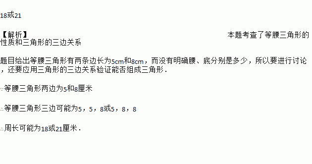 18»ò21 ¡¾½âÎö¡¿±¾Ì⿼²éÁ˵ÈÑüÈý½ÇÐεÄÐÔÖʺÍÈý½ÇÐεÄÈý±ß¹ØÏµ ÌâÄ¿¸ø³öµÈÑüÈý½ÇÐÎÓÐÁ½Ìõ±ß³¤Îª5cmºÍ8cm£¬¶øÃ»ÓÐÃ÷È·Ñü¡¢µ×·Ö±ðÊǶàÉÙ£¬ËùÒÔÒª½øÐÐÌÖÂÛ£¬»¹ÒªÓ¦ÓÃÈý½ÇÐεÄÈý±ß¹ØÏµÑéÖ¤ÄÜ·ñ×é³ÉÈý½ÇÐΣ® ¡ßµÈÑüÈý½ÇÐÎÁ½±ßΪ5ºÍ8ÀåÃ× ¡àµÈÑüÈý½ÇÐÎÈý±ß¿ÉÄÜΪ5£¬5£¬8»ò5£¬8£¬8 ¡àÖܳ¤¿ÉÄÜΪ18»ò21ÀåÃ×£®