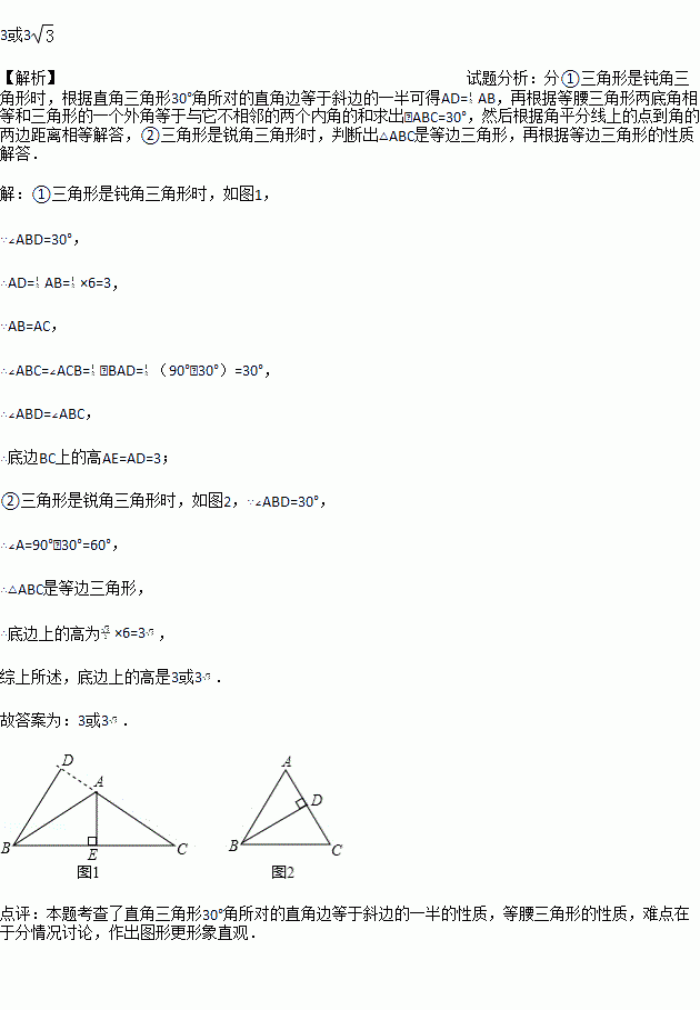 等腰三角形一腰上的高与另一腰的夹角为30°,腰长为6,则其底边长是___.