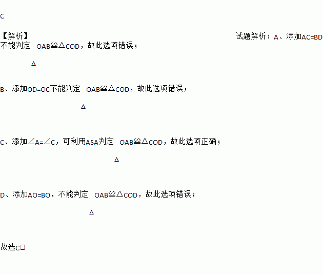 C 【解析】试题解析:A、添加AC=BD不能判定△OAB≌△COD,故此选项错误; B、添加OD=OC不能判定△OAB≌△COD,故此选项错误; C、添加∠A=∠C,可利用ASA判定△OAB≌△COD,故此选项正确; D、添加AO=BO,不能判定△OAB≌△COD,故此选项错误; 故选C.