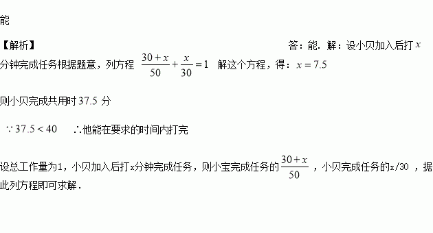 期中考查,信息技术课老师限时40分钟要求每位七年级学生打完一篇文章. 已知独立打完同样大小文章,小宝需要50分钟,小贝只需要30分钟. 为了完成任务,小宝打了30分钟后,请求小贝帮助合作,他能在要求的时间打完吗?