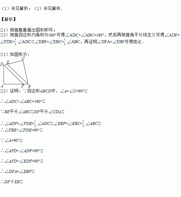在四边形ABCD中,∠A=∠C=90°,BE平分∠ABC,DF平分∠CDA.