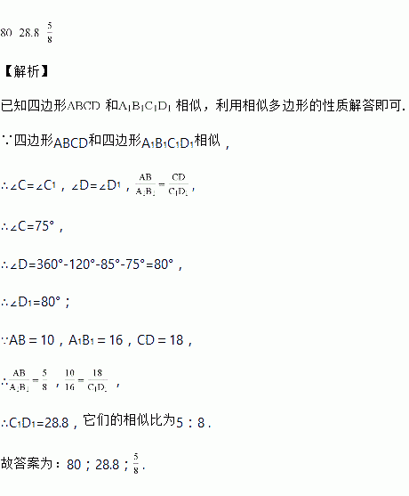 (题文)如图,四边形和相似,已知,.,,,,则________°,________,它们的相似比为________.